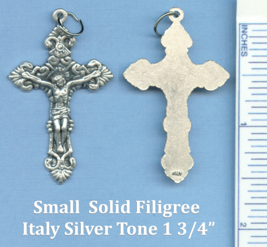 Small Filigree Solid Crucifix Just under 1 3/4″ tall (including top loop) and just over 1″ wide.