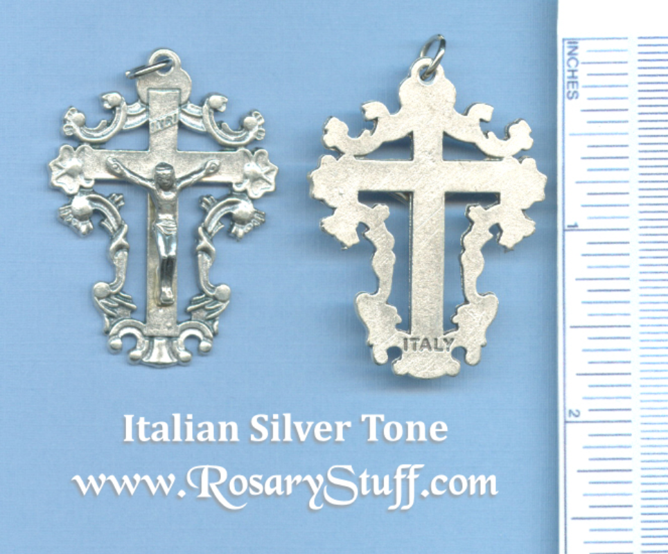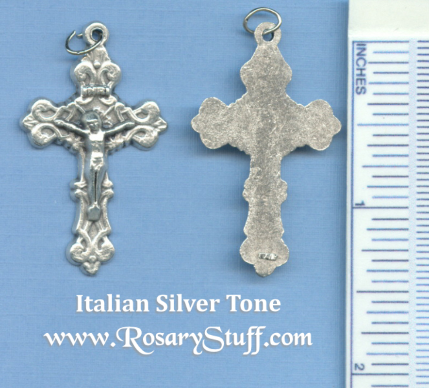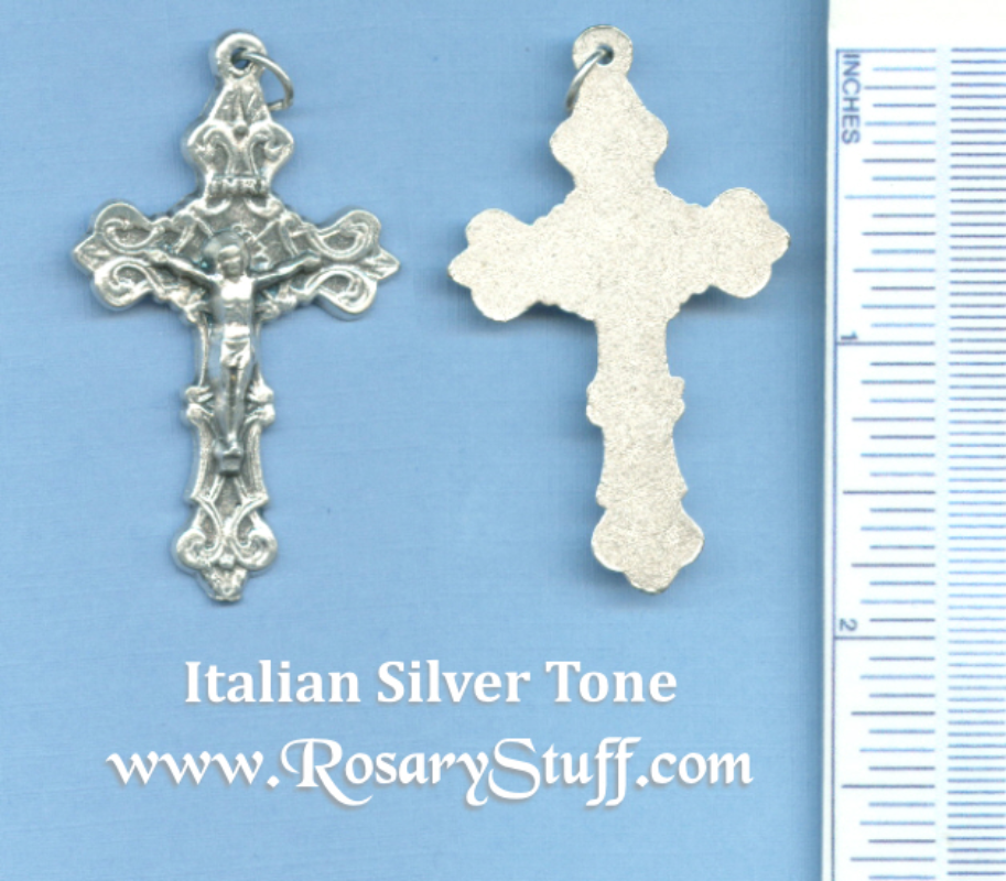 Fleur-de-lis Crucifix Just under 2 1/4″ tall (including top loop) and just under 1 1/2″ wide.