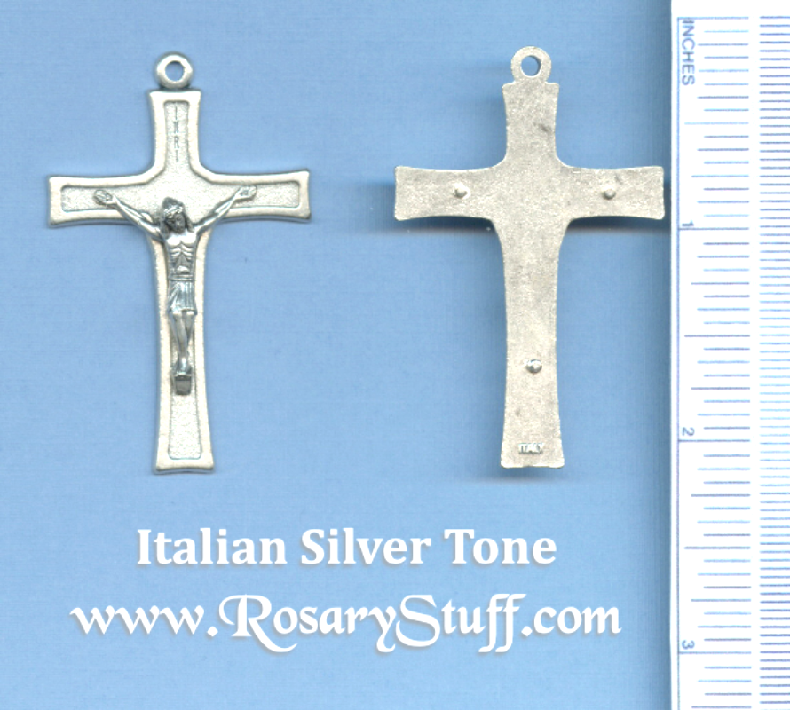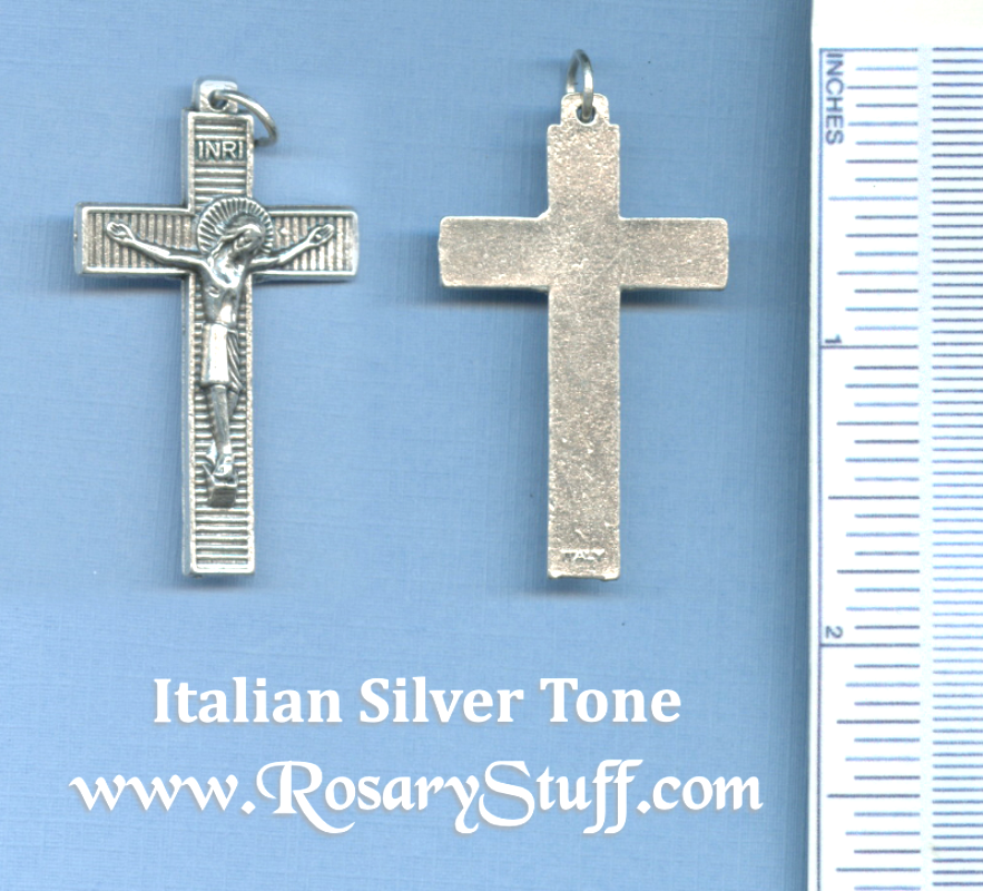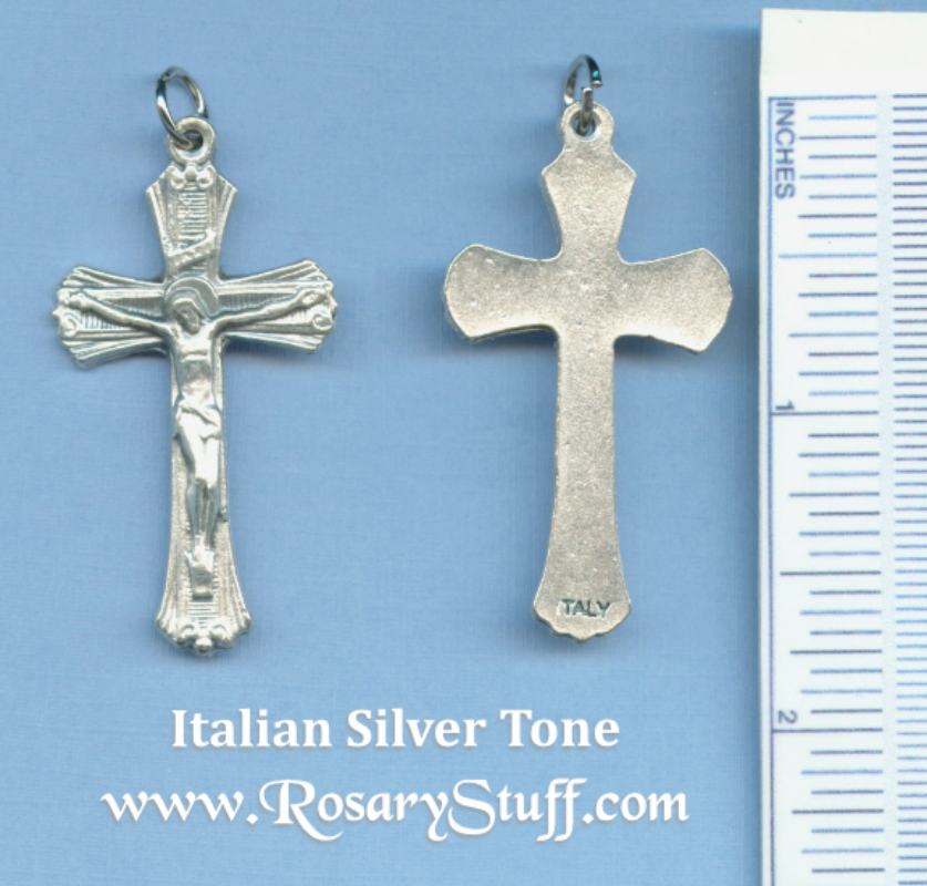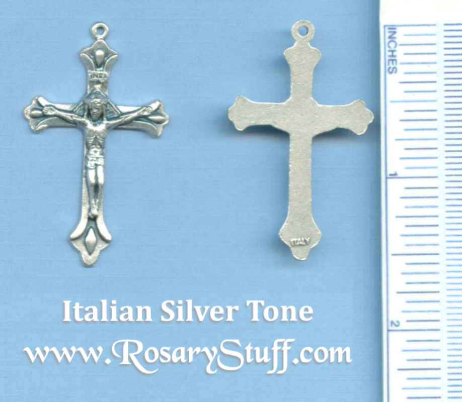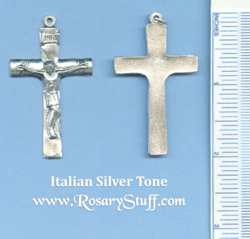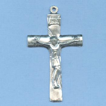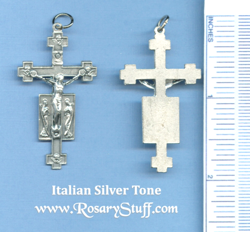 This sweet crucifix features 2 large angels on either side of Jesus and 4 cherub angels at each point on the cross. It is a little over 1 3/4″ tall (including top loop) and 1″ wide.