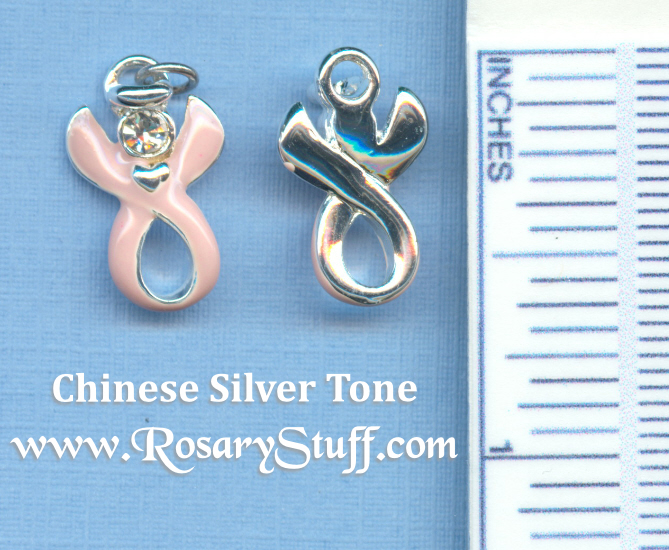 Breast Cancer Guardian Angel Awareness Ribbon Charm Silver plate & enamel with Swarovski face. My own design brought to life by Silver E. 5/8″ tall by 3/8″ wide