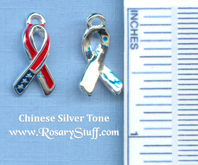 USA Stars & Stripes Awareness RibbonCharm A little over 3/8″ wide by 3/4″ tall including the ring. It features red and blue enamel over silver plated lead-safe pewter.