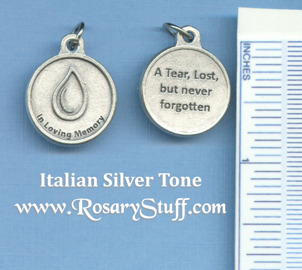 In Loving Memory Medal “A Tear, Lost, But Never Forgotten” on the back. A little over 3/4″ tall and wide (not including ring).