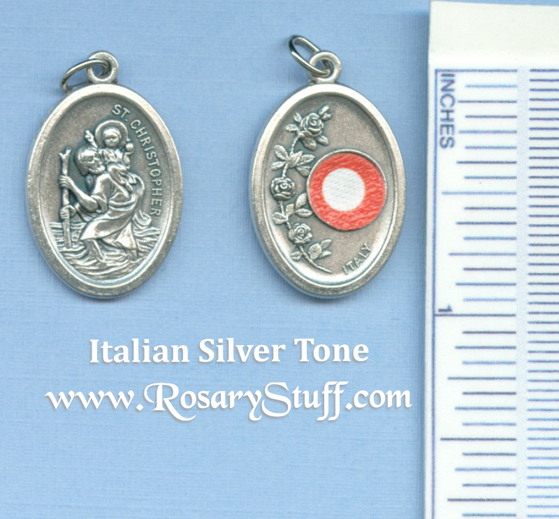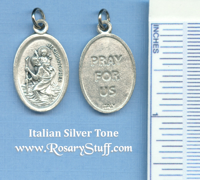 St. Christopher Oval RelicMedal 1″ tall (including the ring) by 5/8″ wide. He is the patron of travelers, bachelors, transportation, traveling, storms, epilepsy, gardeners, holy death, and toothache.