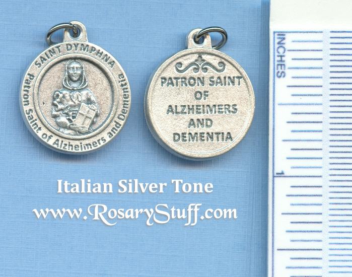 St. Dymphna Round Medal A little over 3/4″ tall and wide (not including ring). St Dymphna is most widely know for her patronage for those suffering from nervous and mental afflictions, but there is actually a long list of other causes she represents including sleepwalking, epilepsy, insanity, family happiness, incest victims, loss of parents, martyrs, mental asylums, mental health caregivers, mental health professionals, mental hospitals, neurological disorders, possessed people, princesses, rape victims and runaways.
