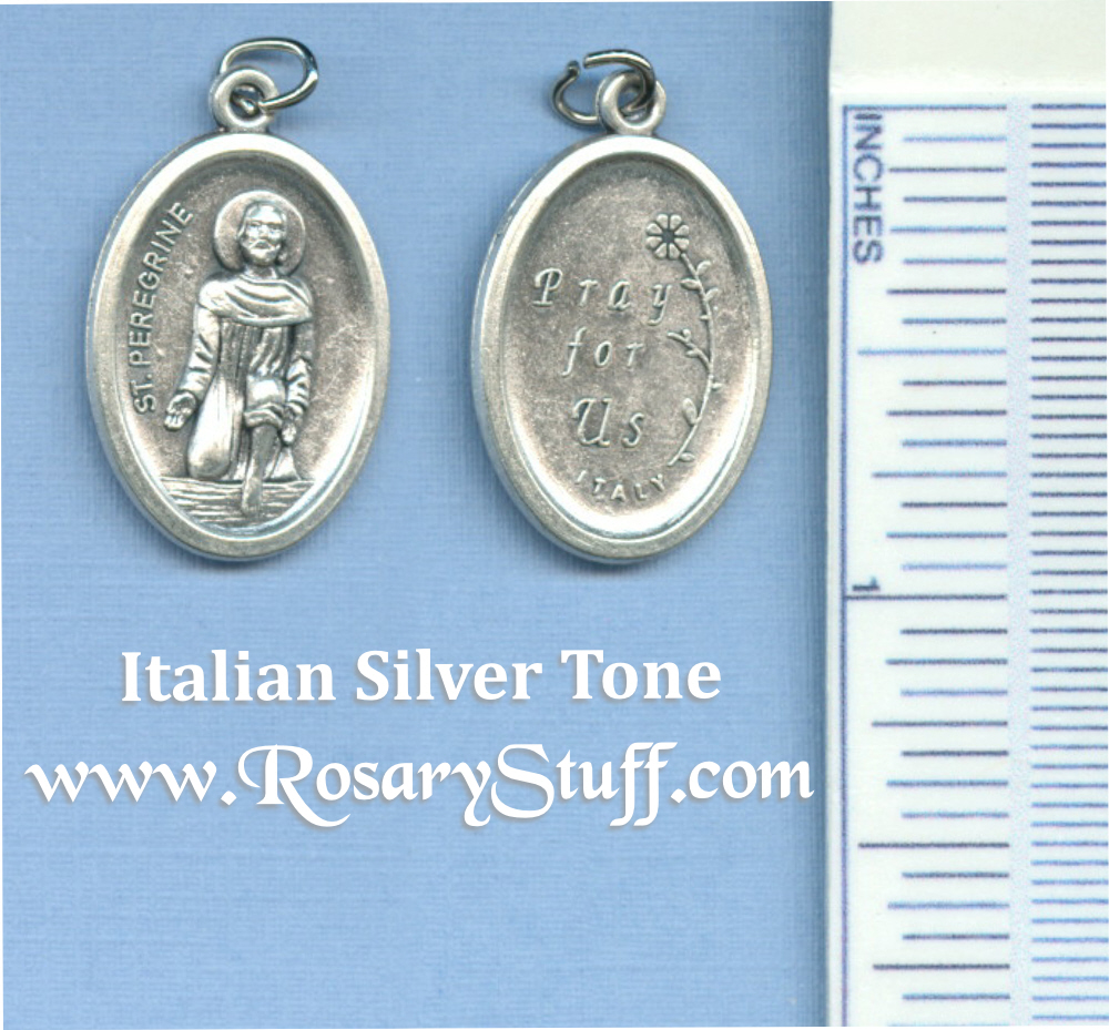 St. Peregrine OvalMedal 1″ tall (including the ring) by a little over 1/2″ wide. Saint Peregrine is the patron of cancer.