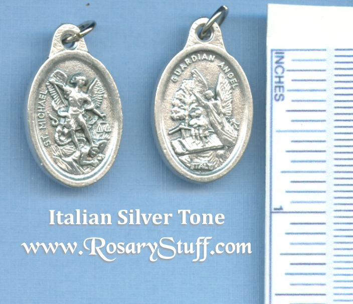 St. Michael & Guardian AngelMedal This double sided medal is 7/8″ tall and 5/8″ wide (not including ring). You can have either side facing forward.
