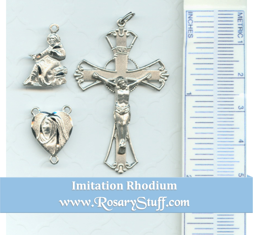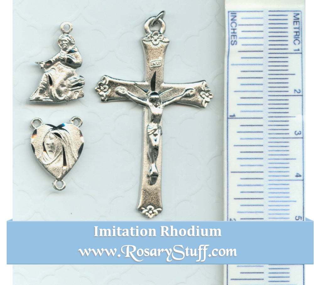 American made imitation rhodium (bright silver over pewter) rosary part set features a moving heart shaped centerpiece, a cutout St. Peregrine charm (patron of cancer) along with a floral crucifix. The center shows a Profile image of Mary crying on the front and a version of the Ecce Homo on the back. The crucifix has flower accents and a plain back. The center measures 1/2 ” wide by 3/4″ tall including the rings, the charm is 3/8″ tall and the crucifix is 1 3/4″ tall by 1 1/8″ wide not including the ring.