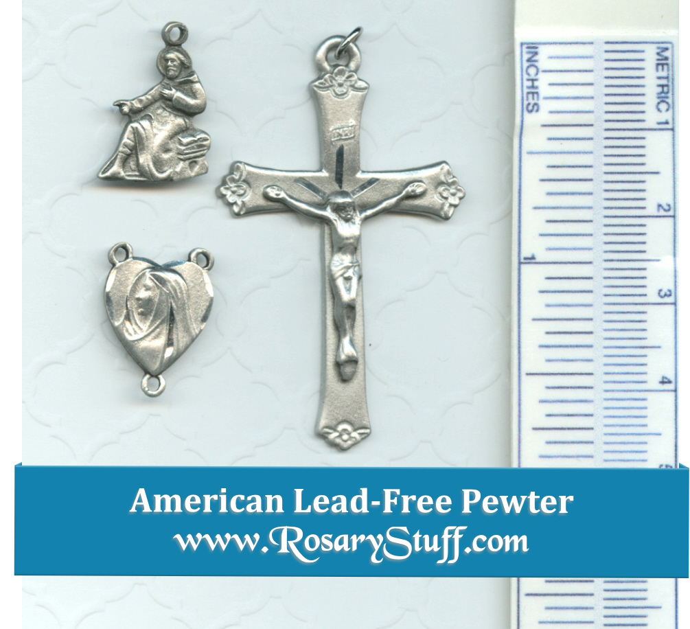 American made pewter rosary part set features a moving heart shaped centerpiece, a cutout St. Peregrine charm (patron of cancer) along with a floral crucifix. The center shows a Profile image of Mary crying on the front and a version of the Ecce Homo on the back. The crucifix has flower accents and a plain back. The center measures 1/2 ” wide by 3/4″ tall including the rings, the charm is 3/8″ tall and the crucifix is 1 3/4″ tall by 1 1/8″ wide not including the ring.