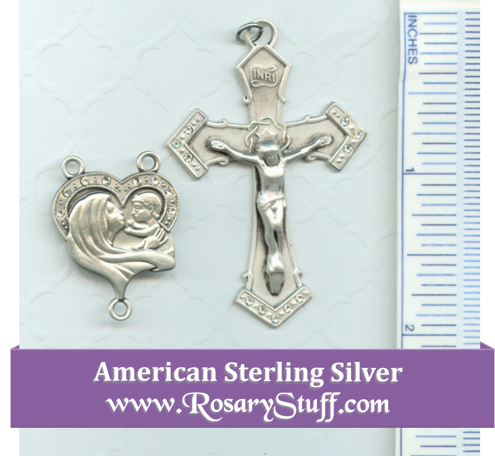 American made sterling silver rosary part set features a sweet image of Mama Mary with her Beautiful Baby Boy and matching crucifix. The heart shaped centerpiece is a little over 3/4 inch wide by 3/4″ long not including the rings. The crucifix is 1 3/4″ tall by 1 1/4″ wide. Both center and crucifix are adorned with pretty clear crystals.