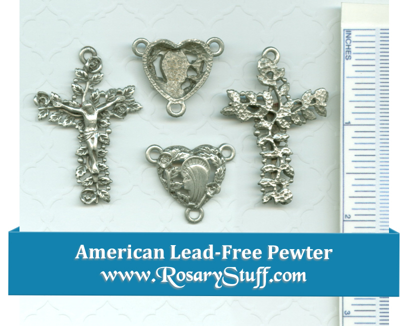 American Pewter set featuring a heart shaped, leafy Mary Center with little roses (3/4″ x 3/4″ without rings) and matching Leafy Rose Crucifix (1 1/2″ x 1″ without rings).