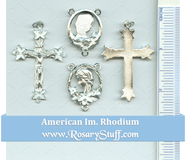 American made imitation rhodium (bright silver toned base metal) rosary part set featuring a young Mary on the center surrounded by white lilies (7/8″ x 1″ without bottom ring) and a matching white lily Crucifix (2″ x 7/8″ without ring).