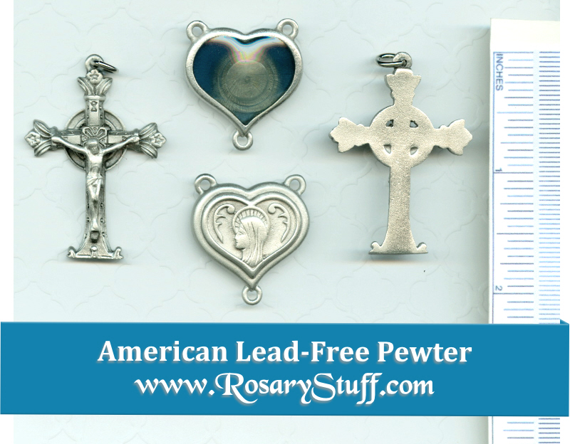 American Lead Free Pewter center and crucifix set features water from Lourdes. The heart shaped Mary Center has a significant amount of water from Lourdes on the back (1″ x 1″ without bottom ring) and comes with a matching Crucifix (1 3/4″ x 1 1/4″ including ring).