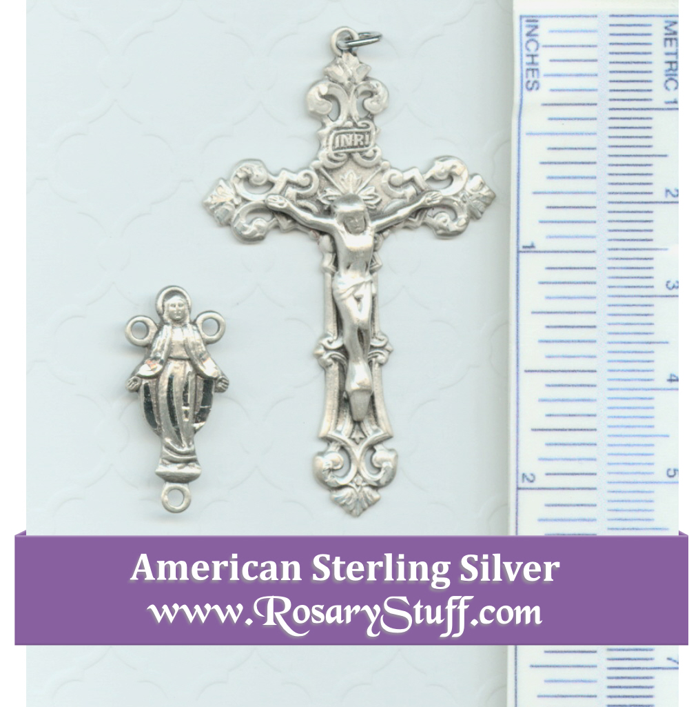 American made sterling silver rosary part set features a cutout version of Our Lady of Grace along with a pretty, traditional, Filigree crucifix. The center is just under 1 inch long by just under 1/2″ wide including the rings. The crucifix is 2″ tall by 1 1/4″ wide not including the top ring.