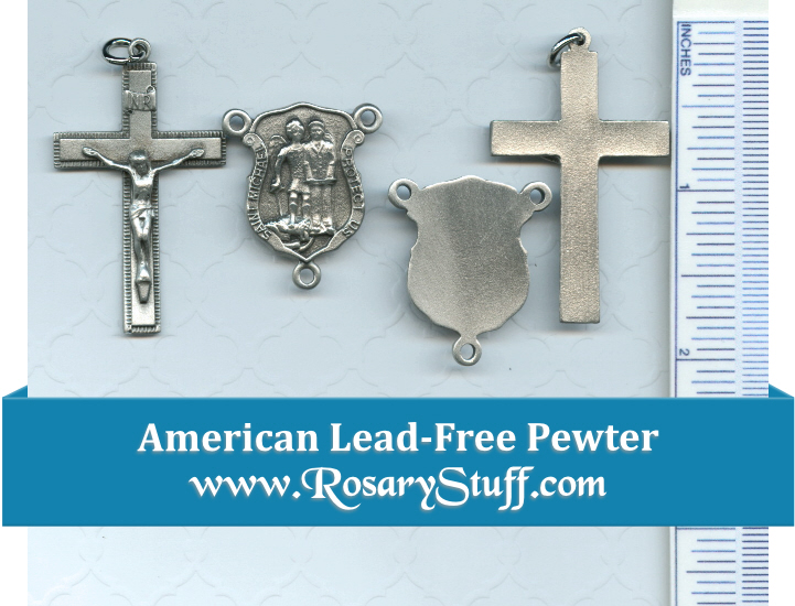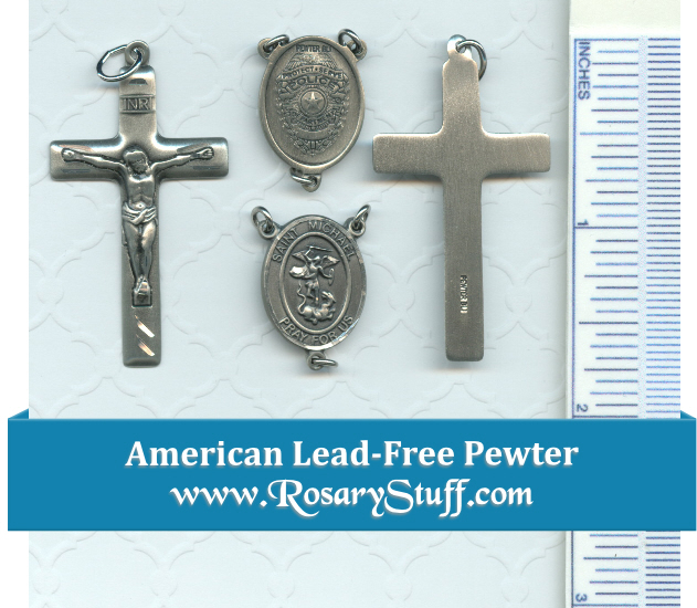 American made pewter rosary part set features way more detail and a darker finish than my shield shaped centerpiece set. Even though the picture makes this center look lighter than it really is, please keep in mind the finish on the centerpiece is aged dark which would look amazing with a darker color bead. This centerpiece features a traditional St Michael medal on the front and a very detailed police shield on the back (3/4″ by 1/2″ wide). The basic crucifix is 1 3/4″ tall by 1/2″ wide. Both pieces also have highlighting on them.
