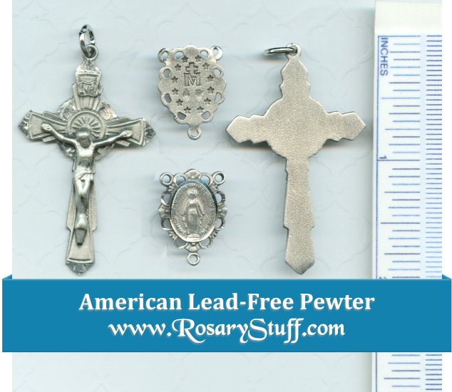 American made pewter featuring a delicate scalloped Miraculous centerpiece (a little over 5/8″ by a little over 1/2″ wide without rings) and an Ornate French crucifix (1 7/8″ x 1 by 1/2″ without ring).