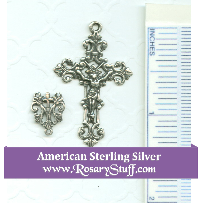 Handmade American made small sterling silver rosary part set features a very ornate filigree design with a center that is only 1/2″ x 3/8″ and a crucifix that is 1 1/2″ x 7/8″. Since this small set is handmade, it will be thinner and more fragile than your normal machine made parts.