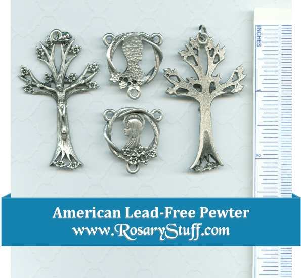 American made, lead free pewter Tree of Life set is a wonderful and modern option for any rosary. The set features an American Pewter Mary Center with flowers and tree branches encircling her (1″ x 1″ including rings) and Tree of Life crucifix (just over 2″ including ring x 1 1/2″).