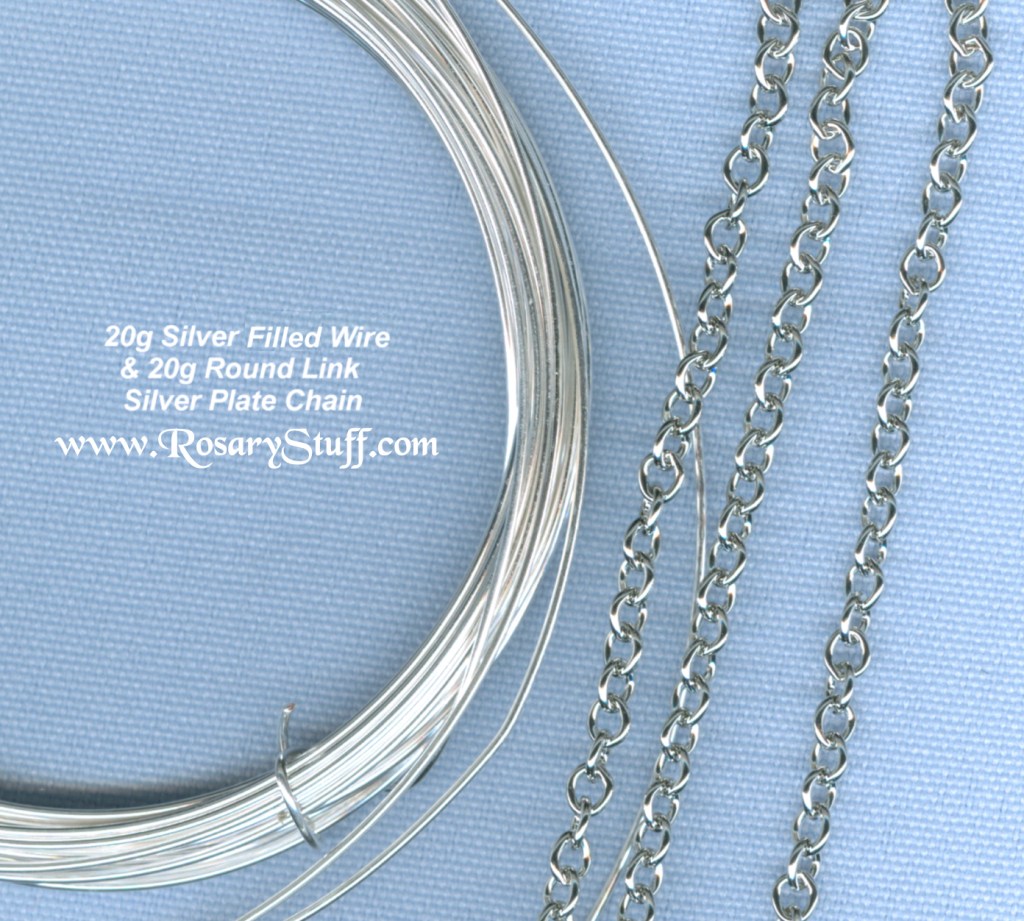 These are the wire and chain options. You can click on the image to see a larger image. If you are considering plated wire and chain, please keep in mind that with extensive use, the silver plating will wear off over time exposing the copper or brass core underneath. The difference between silver plate and silver filled is in the thickness of the plating. Whereas silver plating involves a thin layer of silver over copper and sterling is almost all silver, silver filled wire is a layer of 0.925 or greater silver which is mechanically bonded to a brass or copper core. It is 100’s of times thicker than standard silver plating. 1/10th silver-filled items are at least 1/10th silver by weight, which means the plating will endure longer. So if you plan on using your rosary every day you should consider upgrading to sterling silver or silver filled wire to avoid some of the wear issues associated with basic silver plating.