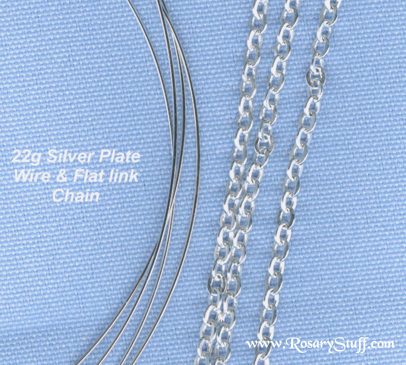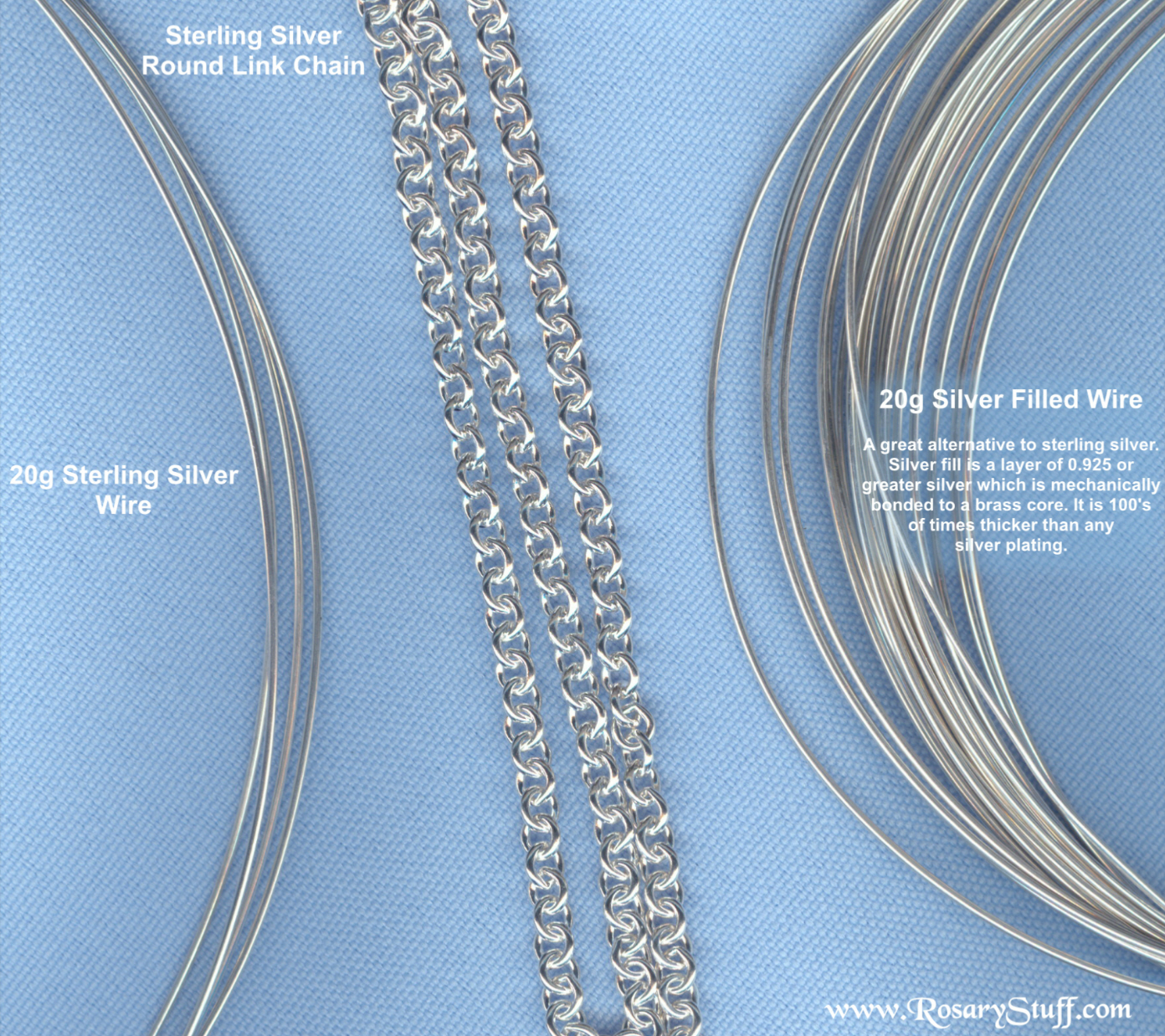 These are the wire and chain options. You can click on the image to see a larger image. If you are considering plated wire and chain, please keep in mind that with extensive use, the silver plating will wear off over time exposing the copper or brass core underneath. The difference between silver plate and silver filled is in the thickness of the plating. Whereas silver plating involves a thin layer of silver over copper and sterling is almost all silver, silver filled wire is a layer of 0.925 or greater silver which is mechanically bonded to a brass or copper core. It is 100’s of times thicker than standard silver plating. 1/10th silver-filled items are at least 1/10th silver by weight, which means the plating will endure longer. So if you plan on using your rosary every day you should consider upgrading to sterling silver or silver filled wire to avoid some of the wear issues associated with basic silver plating.